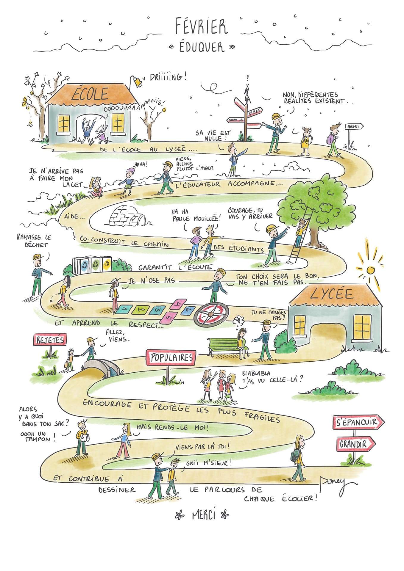 Pour clôturer ce numéro, Poney pose son regard à la fois tendre, critique et décalé sur le monde scolaire. Une respiration graphique qui invite à sourire… et parfois à réfléchir autrement.